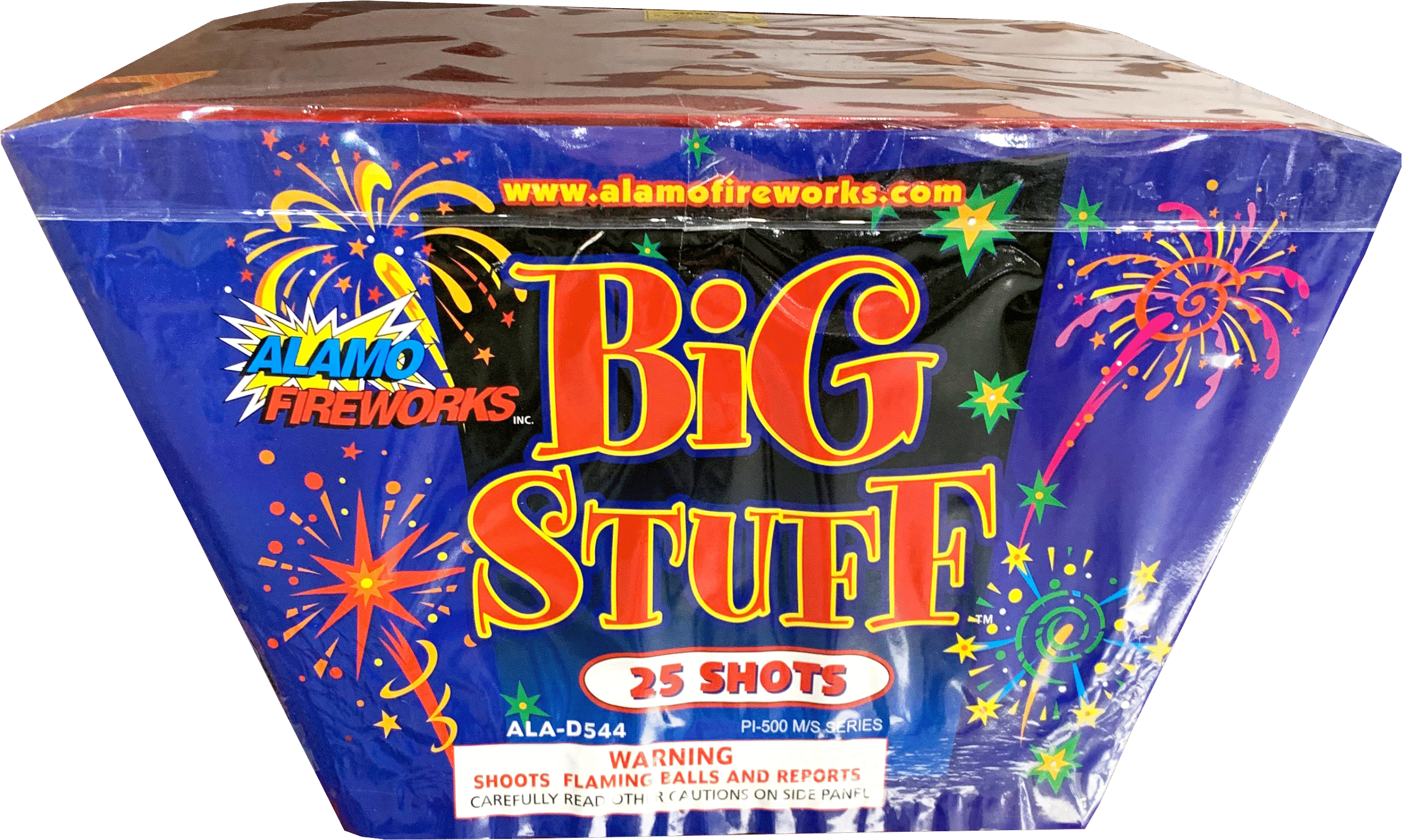 Are you ready to go BIG?! This 25 shot fan cake features huge, multi-layer fan volleys of color and lots of crackle. If you’re looking for a BIG finale and BIG noise, Big Stuff is where it’s at!