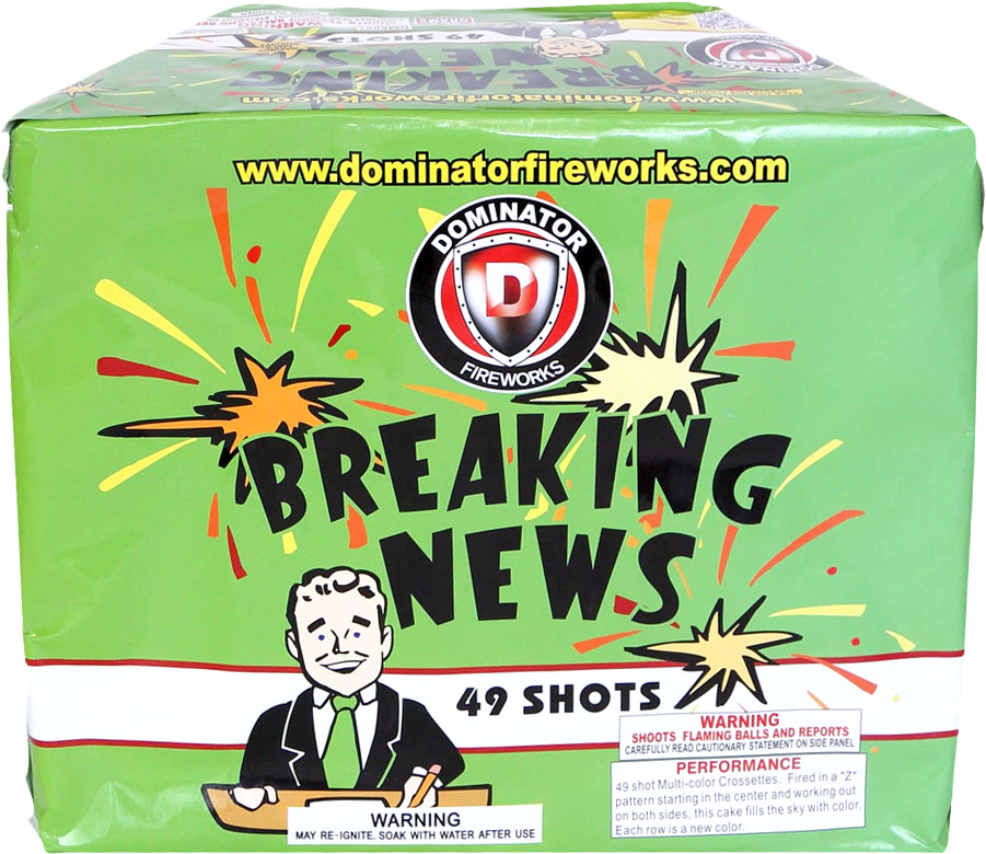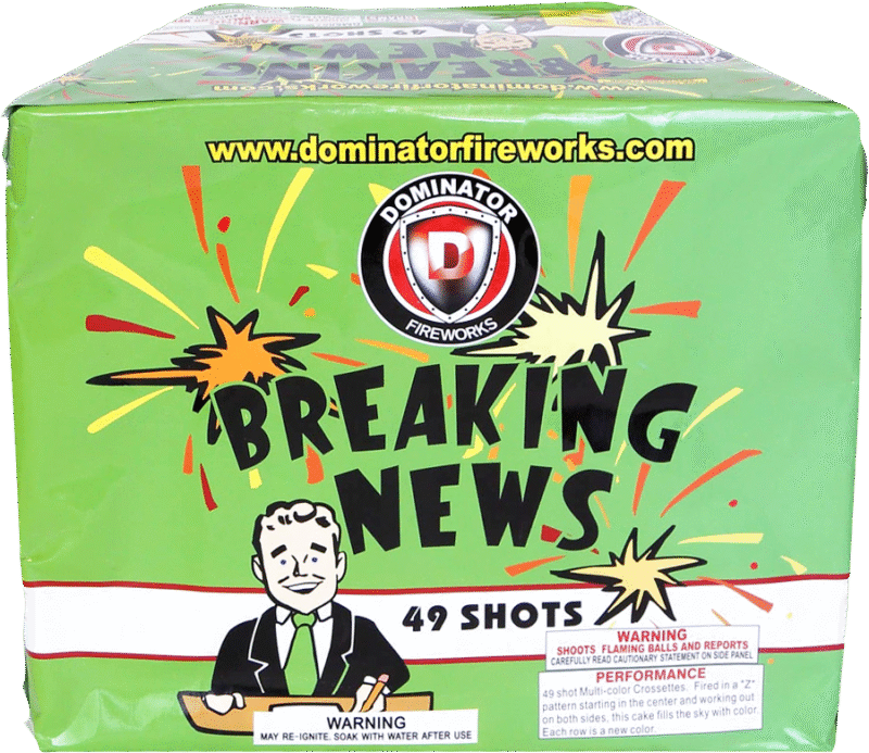 EXTRA EXTRA read all about it…This 500G cake will be all anyone can talk about! Green strobes evolve into a wide fan of gold with a colorful titanium explosion and breaks of blue.
