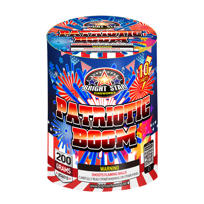 Show off your AMERICAN PRIDE with 10 shots of red, white, and blue strobes, mines, and dahlias