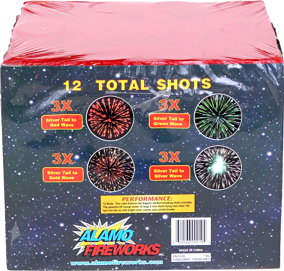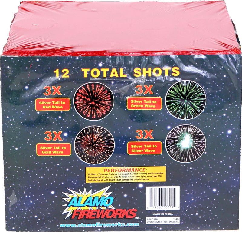 This 12 shot cake is the REAL DEAL. Mega-burst technology sends 12 large 2” shells flying more than 100 feet into the air with bright silver comets before the shells burst into a beautiful display.